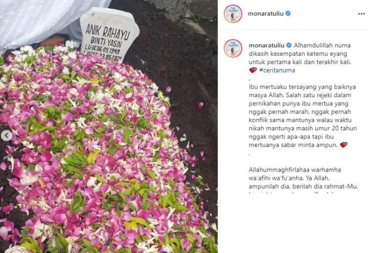 Selain itu, dalam caption tersebut, Mona Ratuliu juga mengenang kebaikan dari sang ibu mertua. Menurutnya, Anik Rahayu adalah seorang sosok mertua idaman karena selama ini tak pernah berkonflik dengan menantunya.