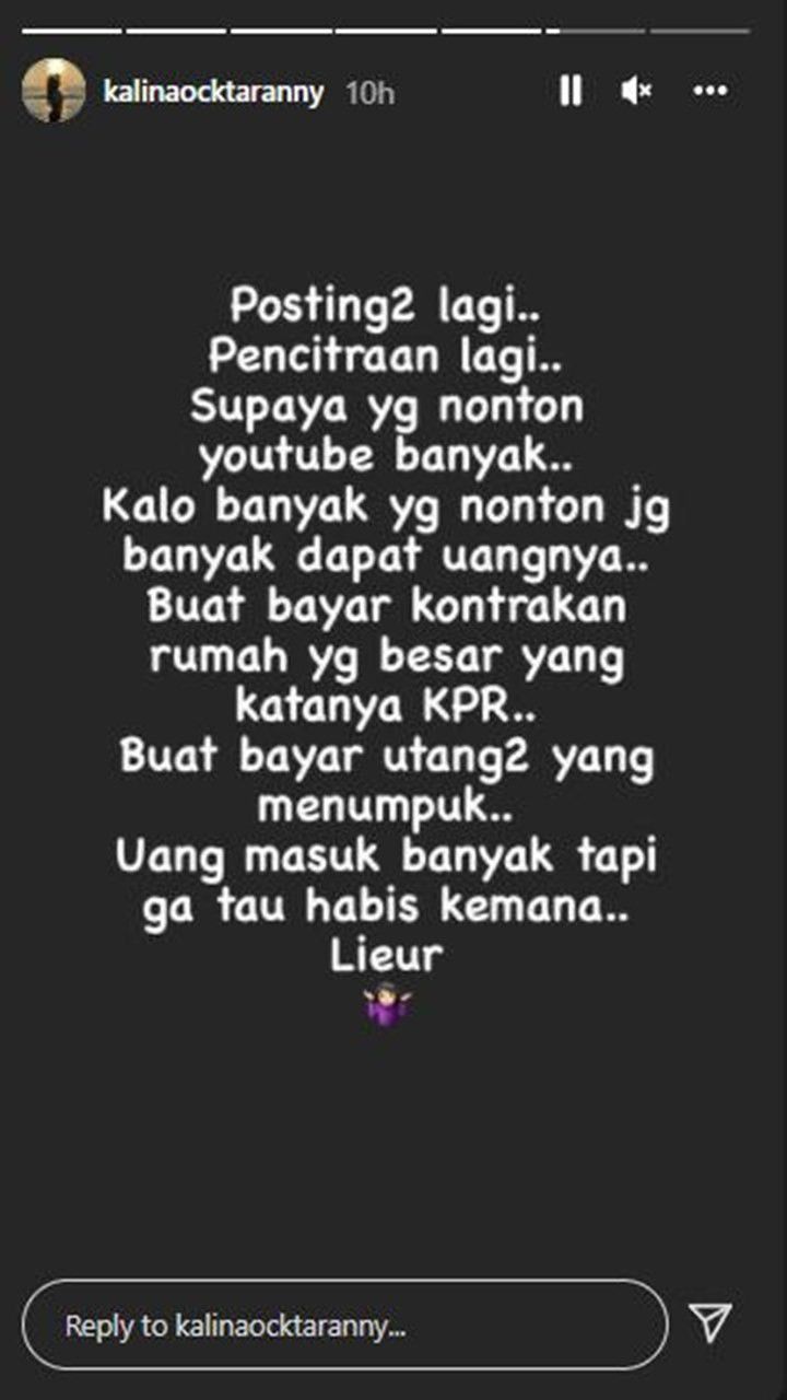 "Untuk anda, kalau ada masukan, hujatan, atau apa pun itu tentang anda di kolom komentar, jangan dihapus dong. Kok dihapus sih? Selamat menikmati undangan-undangan ke stasiun TV. Lumayan untuk biaya bayar kontrakan rumah yang gede," tutup Kalina.