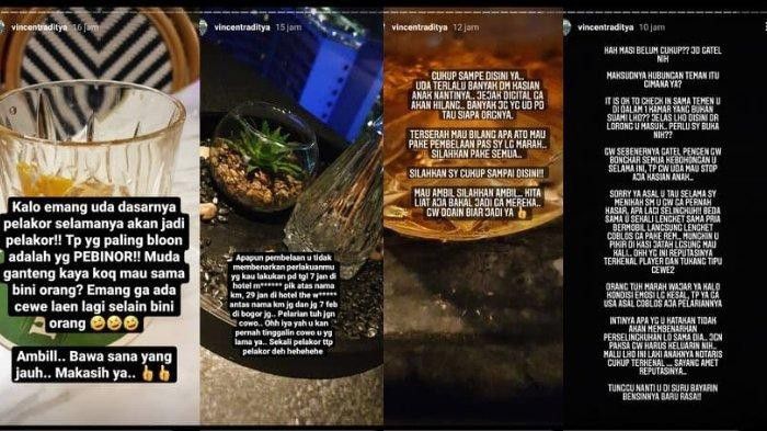 Ia tidak menjelaskan darimana ia mendapatkan video tersebut. Tetapi Vincent yakin kalo itu merupakan bukti yang menunjukkan istrinya bermain dengan laki-laki lain. Ia pun menjulukinya dengan sebutan pebinor di Instagram Stories.