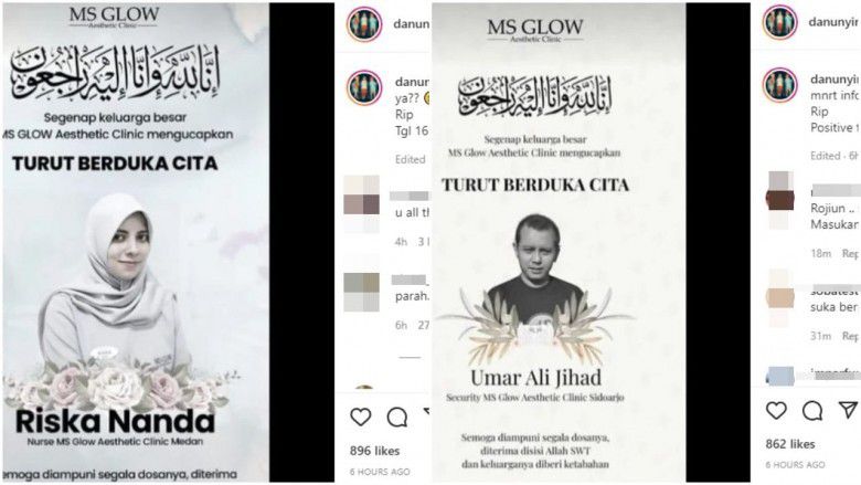 "Segenap keluarga besar MS GLOW AESTHETIC Clinic mengucapkan turut berduka cita Riska Nanda Nurse MS Glow Aesthetic Clinic Medan Semoga diampuni segala doasanya diterima disisi Allah SWT, dan keluargaya diberi ketabahan," tutur pihak MS Glow dari Insta Story @msglowbeauty.
