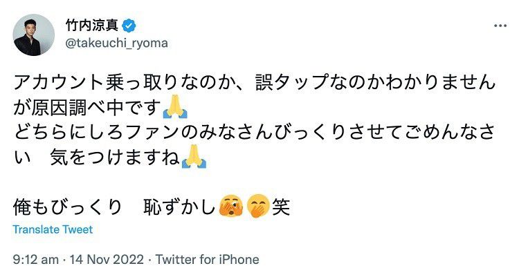 "Aku tak tahu apakah akun ku di-hack atau aku tak sengaja mem-follow nya, namun aku sedang menyelidikinya. Selain itu, aku mohon maaf karena sudah mengejutkan semua fans dan aku akan lebih hati-hati. Aku juga kaget dan merasa sangat malu lol," cuit Ryoma Takeuchi di Twitter dengan menyertakan emoticon tertawa.