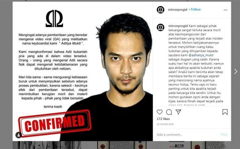 "Mengingat adanya pemberitaan yang beredar mengenai video viral (GA) yang melibatkan nama keyboardist kami "Aditya Mukti". Kami mengkonfirmasi bahwa Adit bukalah pria yang ada dalam video tersebut," tulis @mirrorprogid, Minggu (8/11/2020).