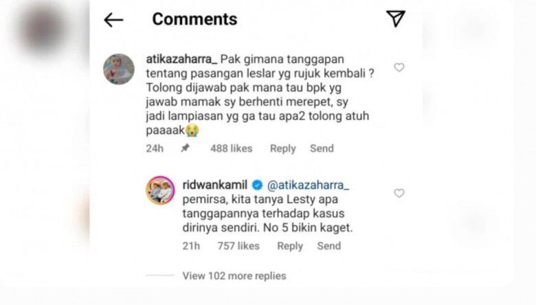 "Pak gimana tanggapan tentang pasangan Leslar yang rujuk kembali? Tolong dijawab pak mana tahu bapak yang jawab, Mama saya berhenti merepet. Saya jadi lampiasan yang gak tahu apa-apa. Tolong atuh pak," komentar akun @atikazah***.