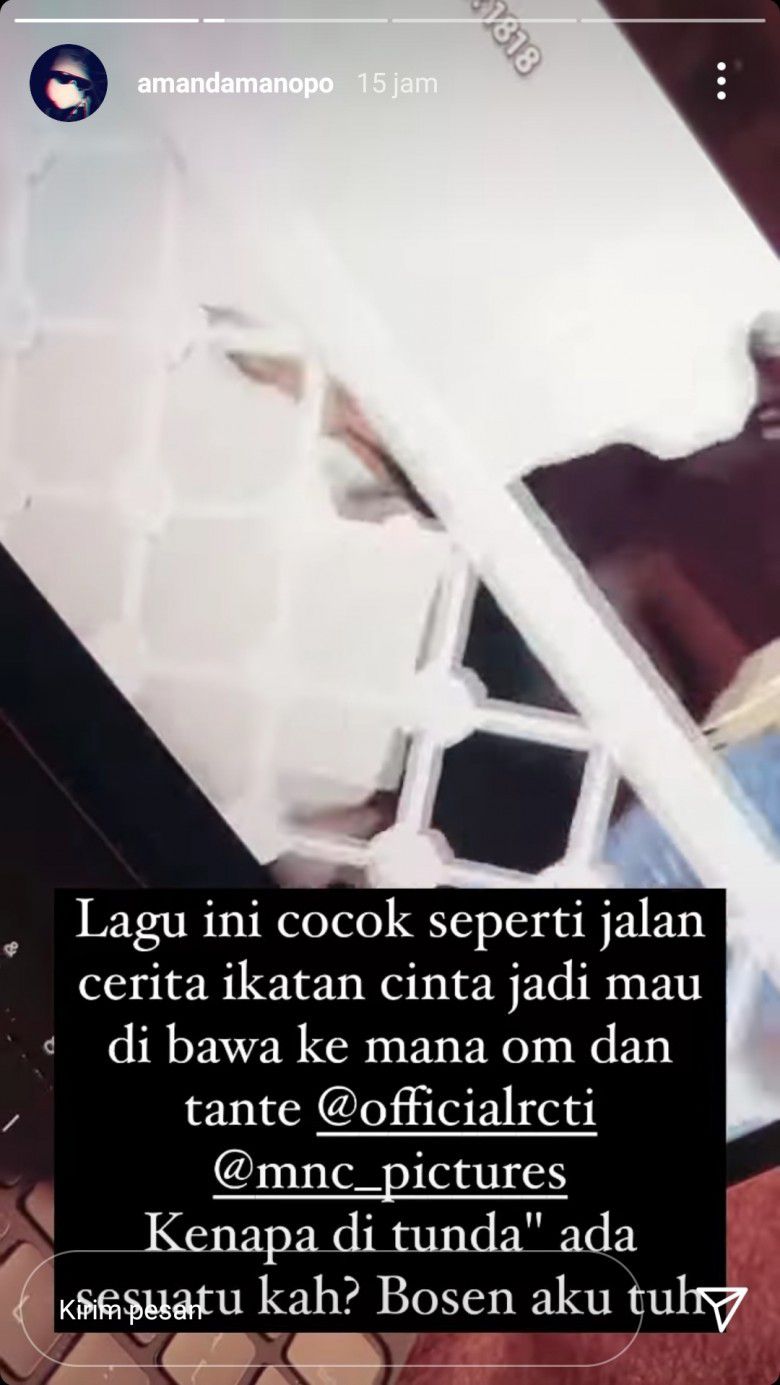 “Lagu ini cocok seperti Ikatan Cinta, jadi mau dibawa kemana om tante @officialrcti @mnc_pictures. Kenapa ditunda-tunda? Ada sesuatu kah? Bosen aku tuh” tulis Amanda di IGS akun pribadinya.