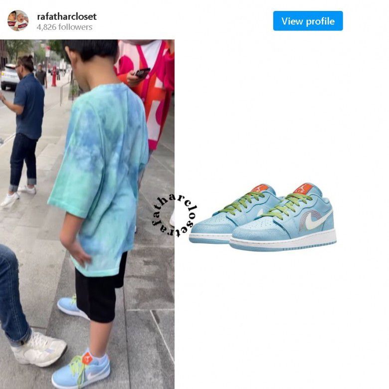 Ketika berlibur di New York, Rafathar sempat memakai sepatu Nike AIr Jordan 1 Low Blue Stitch yang matching dengan outfitnya kala itu yang bernuansa biru.