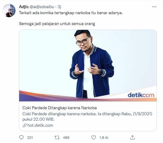 "Terkait ada komika tertangkap narkoba itu benar adanya. Semoga jadi pelajaran untuk semua orang," tulis Adjis Doaibu.