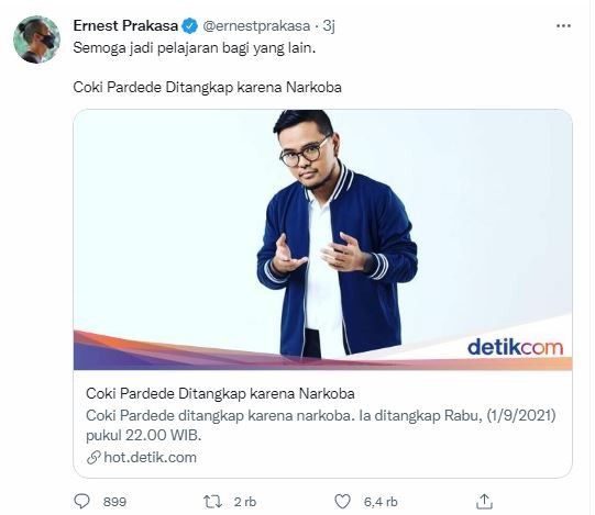 "Semoga jadi pelajaran bagi yang lain," tulis Ernest Prakasa, sambil menyertakan berita penangkapan Coki Pardede.