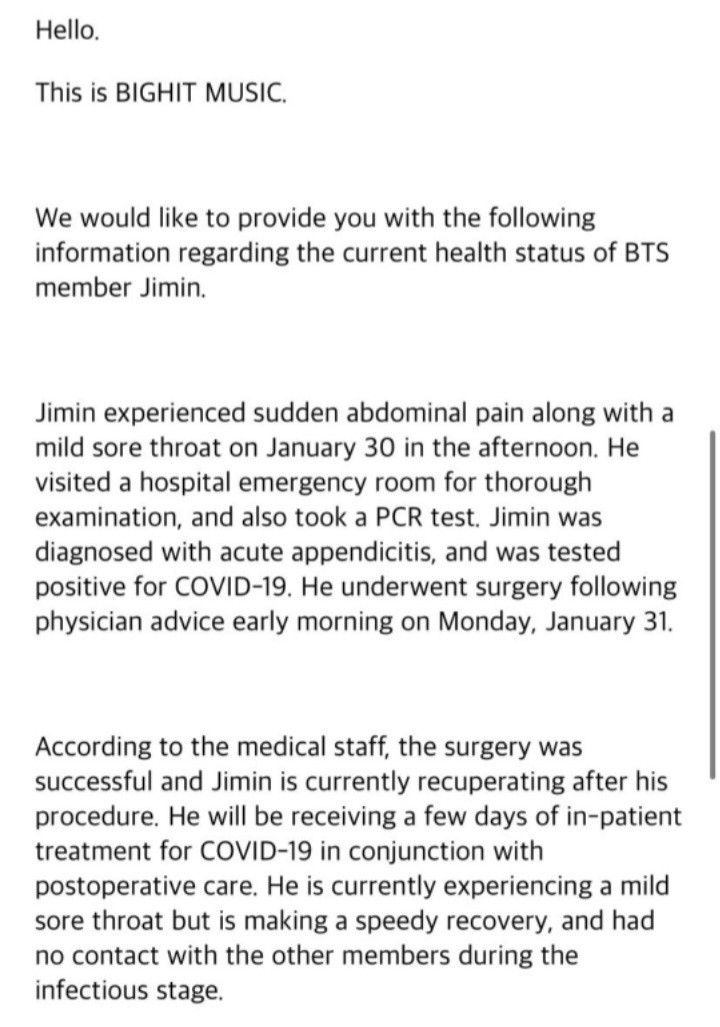 “Dia mengunjungi ruang gawat darurat rumah sakit untuk pemeriksaan menyeluruh, dan juga mengambil tes PCR. Jimin didiagnosis dengan usus buntu akut, dan diuji positif untuk COVID-19. Ia menjalani operasi mengikuti nasihat dokter pada hari Senin pagi, 31 Januari,” sambungnya.