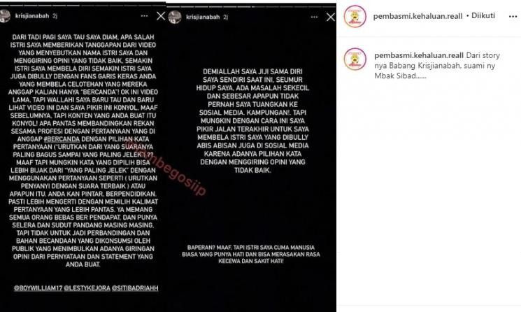 "Tapi mungkin dengan cara ini saya pikir ini jalan terakhir untuk saya membela istri saya yang di-bully abis-abisan di sosial media karena adanya pilihan kata dengan menggiring opini yang tidak baik. Baperan? Maaf tapi istri saya cuma manusia biasa yang punya hati dan bisa merasakan rasa kecewa dan sakit hati!" tegas Krisjiana Baharudin.
