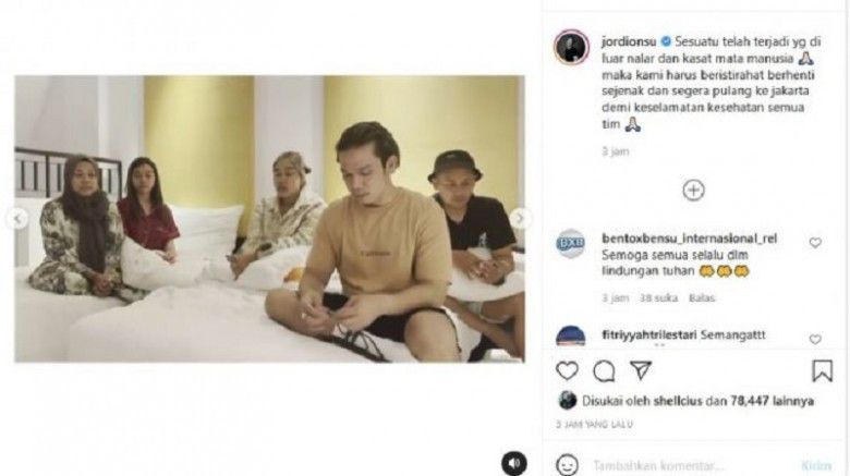 "Sore ini salah satu mobil dari tim kami mengalami kecelakaan," tutur Jordi dalam unggahan di Instagramnya pada Jumat (9/4). "Mohon maaf juga dari kami, untuk lokasi kedua pada episode ke-4, terpaksa (tidak dilanjutkan)," lanjutnya.