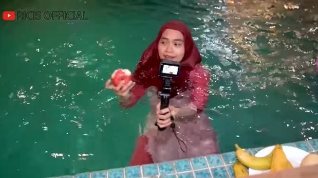 Di video tersebut, tampak dirinya memakai baju lengan panjang dan hijab berwarna merah. Ria Ricis terlihat sedang berada di kolam renang sembari membawa anggur.