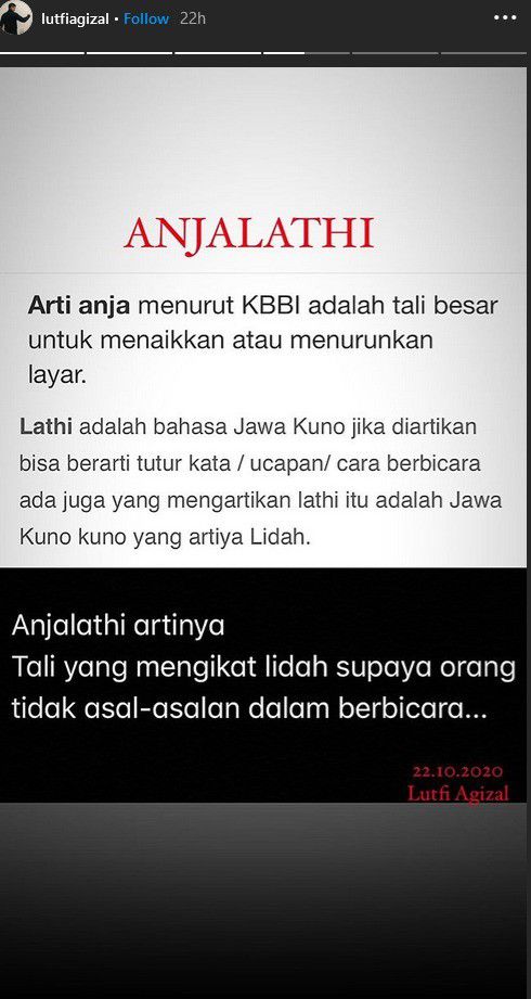"Anjalathi artinya tali yang mengikat lidah supaya orang tidak asal-asalan dalam berbicara," keterangan dalam Insta Story Lutfi itu.