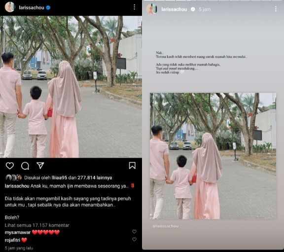 Mengiringi unggahan itu, Larissa terlihat menuliskan pesan haru yang ditujukkan untuk sang buah hati dari pernikahannya dengan Alvin. Dalam pesan tersebut, Larissa Chou meminta izin pada sang anak untuk membawa seseorang masuk dalam kehidupan mereka.