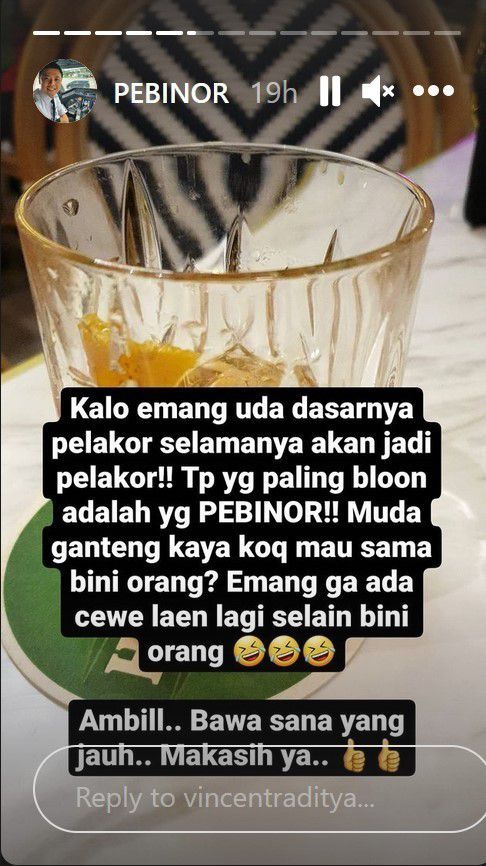 "Kalau emang udah dasarnya pelakor selamanya akan jadi pelakor!! Tapi yang paling bloon adalah yg PEBINOR!! Muda ganteng kaya kok mau sama bini orang? Emang ga ada cewe laen lagi selain bini orang... Ambill.. Bawa sana yang jauh... Makasih ya..," tulis Kapten Vincent.