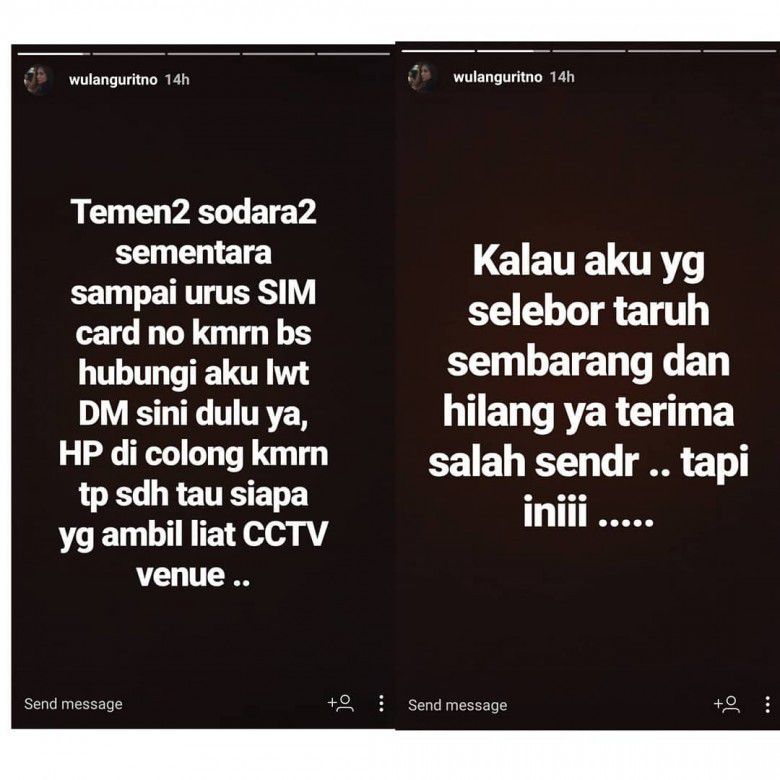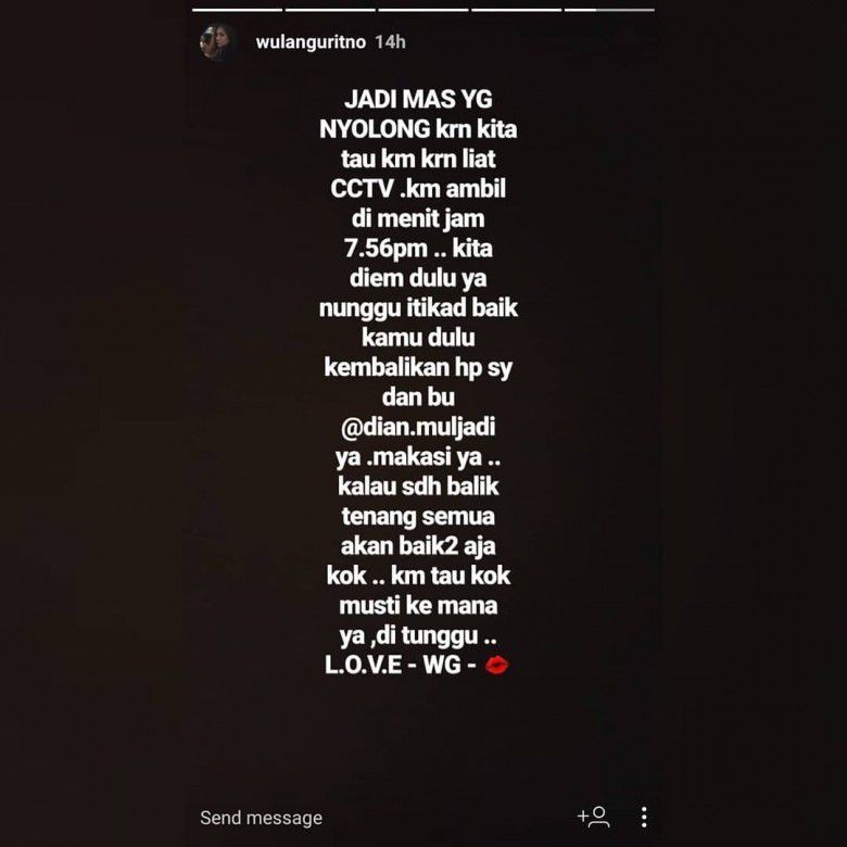 Masih dalam Insta Story-nya, Wulan meminta kepada si pencuri untuk mengembalikan barang-barang yang telah dicurinya. Wulan pun berjanji ajan menyelesaikan masalah ini baik-baik bila ponselnya itu kembali.