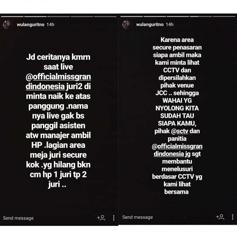 Dalam Insta Story tersebut, Wulan menjelaskan bahwa dia harus meninggalkan barang-barang pribadinya ketika diminta naik ke atas panggung. Begitu naik ke panggung, ia menemukan bahwa ponselnya dan salah satu juri lainnya hilang.