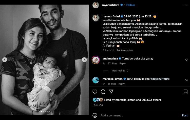 "Ya Allah kami mohon lapangkan dan terangkan kuburnya, ampuni dosanya, tempatkan ia di Surga terbaikmu. Lapangkan hati kami Ya Allah. See you in Jannah papa Tariq (nama anak Raya dan Abid Zia). Al-Fatihah," ungkap Raya Kitty.
