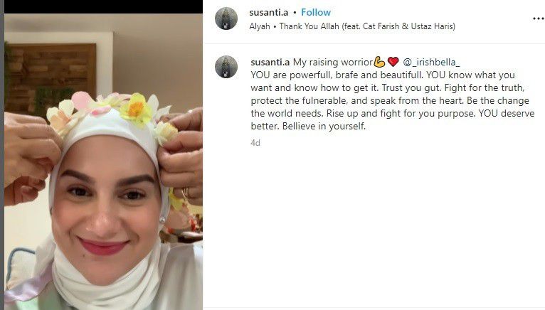 Dalam video tersebut, Santi Arifin mengunggah video Irish Bella sedang didandani dan memancarkan wajah yang cantik. “My raising worrior @_irishbella_YOU are powerfull, brafe and beautifull. YOU know what you want and know how to get it. Trust you gut. Fight for the truth, protect the fulnerable, and speak from the heart. Be the change the world needs. Rise up and fight for you purpose. YOU deserve better. Bellieve in yourself,” tulis Santi Arifin.