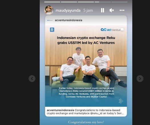 Adalah startup bernama REKU yang bergerak dalam bidang pertukaran dan pasar kripto di Indonesia. Dalam unggahannya, Maudy memberikan ucapan selamat atas keberhasilan yang didapatkan oleh Jesse. “Congrats my love,” tulis Maudy.