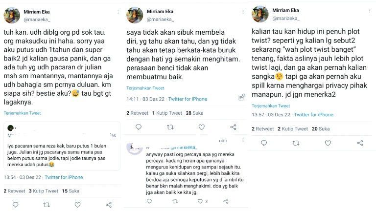 "Kalian tau kan hidup ini penuh plot twist? Seperti yg kalian lg sebut2 sekarang 'wah plot twist banget'. Tenang, fakta asllinya jauh lebih plot twist lagi dan ga akan pernah kalian sangka. Tapi ga akan pernah aku spill karena menghargai privacy pihak manapun. Jd jgn menerka2," tandas Mirriam Eka.