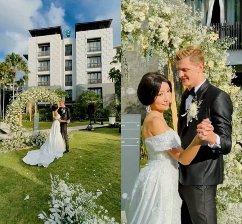 Terlihat dirinya mengenakan gaun putih, sedangkan Alan memakai setelan jas berwarna hitam.