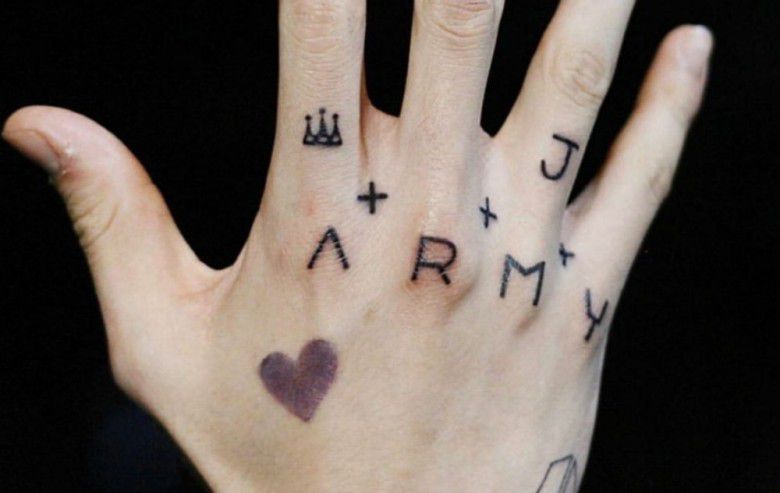 Army adalah tato paling menonjol di tangan Jungkook. A di ARMY tidak memiliki garis, membuatnya terlihat seperti V terbalik. Fans mengira itu adalah kombinasi dari nama fandom BTS, "ARMY," dan inisial para anggota (V, RM, dan Yoongi).