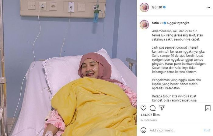 "Nggak nyangka. Alhamdulillah, aku dari dulu tuh termasuk yang jaraaaang sakit, atau sekalinya sakit, sembuhnya cepet," demikian tulis Fatin dalam unggahannya. Dia juga mengunggah foto terkini dirinya yang sedang menjalani perawatan.