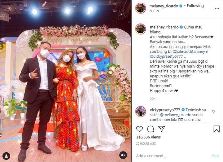 "Terimksh ya sister @melaney_ricardo sudah comblangin kita maka dari itu km ikut bertanggung jwab atas kelangsungan rumah tangga kami @kalinaocktaranny," kata Vicky.