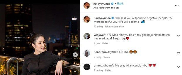 “Don’t let the noise of other’s opinions drown out your own inner voice,” tulis Nindy di unggahan foto 31 Agustus menegaskan ia yang tak peduli pada omongan orang terhadap dirinya. “Tetap kalem dan stay woles,” keterangan foto dirinya memakai dress hitam pada 12 September.