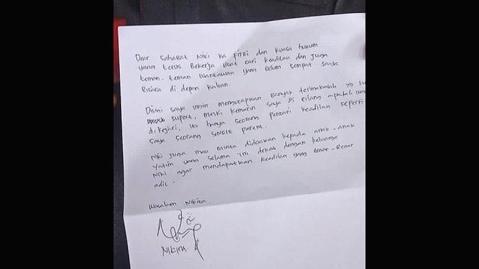 "Dear sahabat Niki, Kak Fitri dan kuasa hukum yang terus bekerja buat cari keadilan, dan juga teman-teman wartawan yang belum sempat saya bicara di depan kalian," tulis Nikita Mirzani membuka suratnya