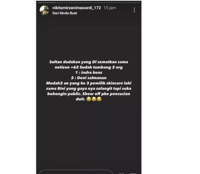 Melalui akun gosip @komentatorpedas_official, terlihat hasil screenshot Instagram Story milik Nikita yang menyindir para sultan dadakan, termasuk Indra Kenz dan Doni Salmanan.