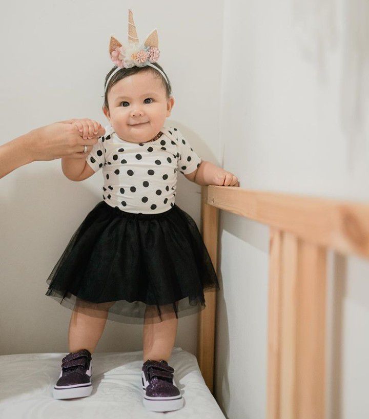 Kaos dengan motif yang dipadu dengan tutu memang simple menggemaskan. Kamu juga bisa menambahkan bandana sebagai aksesoris agar si kecil makin imut.