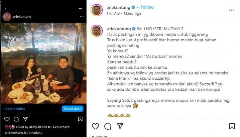 “NI LHO ISTRI MUDAKU? Ha3x postingan ini yg dibawa media untuk nggoreng Trus bikin judul profokastif biar buzzer mainin buat bahan postingan hating,” tulis Arie yang sempat jadi vokalis band “Taboo”.