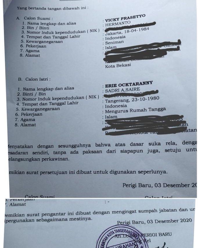 Dalam surat pengantar pernikahan yang akan diserahkan kepada pihak Kantor Urusan Agama tersebut, tertulis nama Vicky Prasetyo dan Erie Ocktaranny (nama asli Kalina Ocktaranny) yang telah ditandatangani.