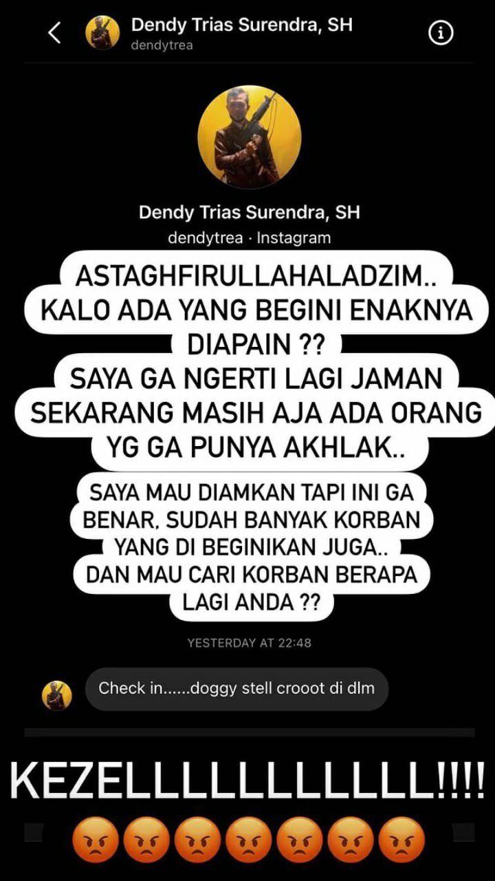 Lewat unggahan Insta Stories di akun Instagram pribadinya, Nabilla mengunggah bukti pesan berupa kata-kata kurang pantas yang dilontarkan pria bernama Dendy Trias Surendra.