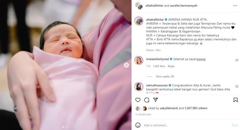 “AMEENA HANNA NUR ATTA. AMEENA = Terpercaya & Setia dan juga Terinspirasi Dari nama ibu nabi perempuan hebat yang melahirkan Manusia Paling mulia,” tulis Atta Halilintar dalam foto yang diunggahnya pada Sabtu, 26 Februari.