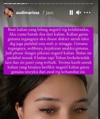 Audi menegaskan bahwa bulan April ini usia kandungannya memasuki 32 minggu atau 8 bulan, tapi menurutnya Tuhan memiliki kehendak yang lain dan pasti ini jalan yang terbaik."Terima kasih untuk kalian yang bisanya berfikir negatif kalian gatau gimana storyku dari awal ttg kehamilanku," tambah Audi.