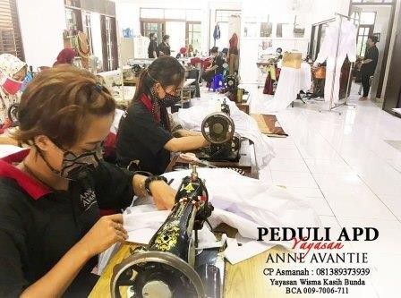 Bunda Anne Avantie membagikan beberapa foto pembuatan APD di Instagram-nya. Terlihat para pekerja wanita sedang membuat Alat Pelindung Diri. Bahkan sebagian dari mereka juga pakai APD. Minimal pakai masker.