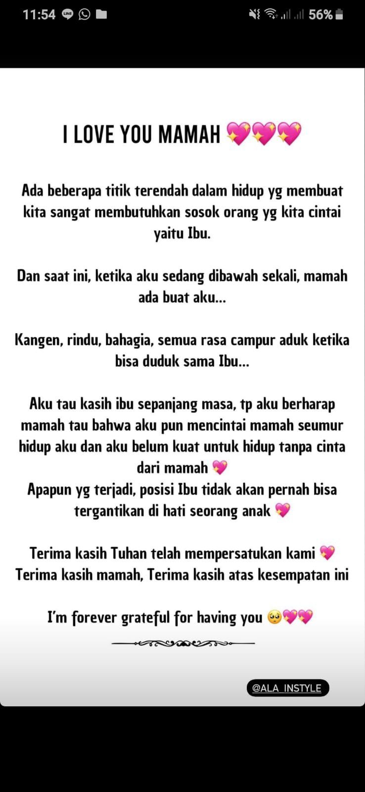 Menandai akun Instagram Mama Ala yakni @ala_instyle, Tasyi begitu berterima kasih kepada Tuhan juga kepada Mama Ala karena dapat kesempatan bersatu kembali.Syech Zaki Alatas, sang suami Tasyi Athasyia yang menemani dan membantu meredakan konflik Tasyi dengan keluarga juga turut disebut dalam pesan khususnya.