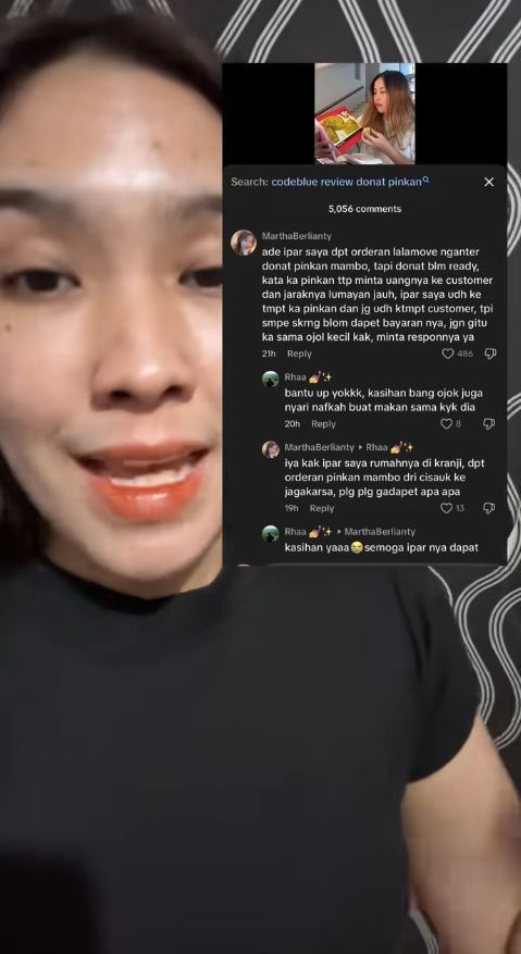 Hal ini diviralkan oleh wanita bernama Martha yang merupakan kakak ipar dari kurir Lalamove yang komplain di kolom komentar. Ia bercerita kalau adik iparnya mendapatkan pesanan pelanggan untuk mengirim donat Pinkan Mambo.