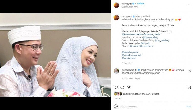 Dalam unggahan itu, presenter 42 tahun tersebut memperlihatkan potret dirinya dan sang suami di meja akad. Mengiringi fotonya, Terry Putri mengucap syukur dan memanjatkan doa untuk pernikahannya dengan Derly Darmawan.