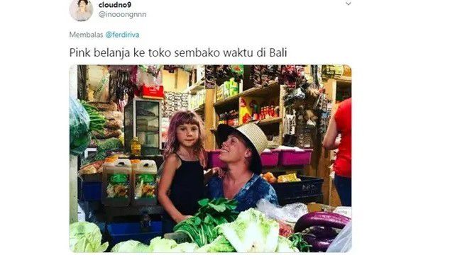Jelaskan dua korelasi foto di atas... What Pink sedang belanja di toko sembako saat di Bali gengs. Duh kira-kira masak tumis apa ya neng Pink?
