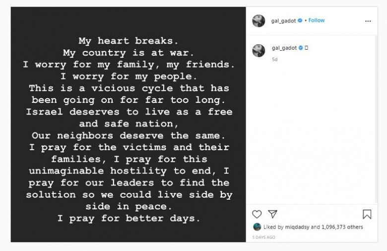 Postingan Gal Gadot Mengenai Konflik Palestina dan Israel (Instagram)