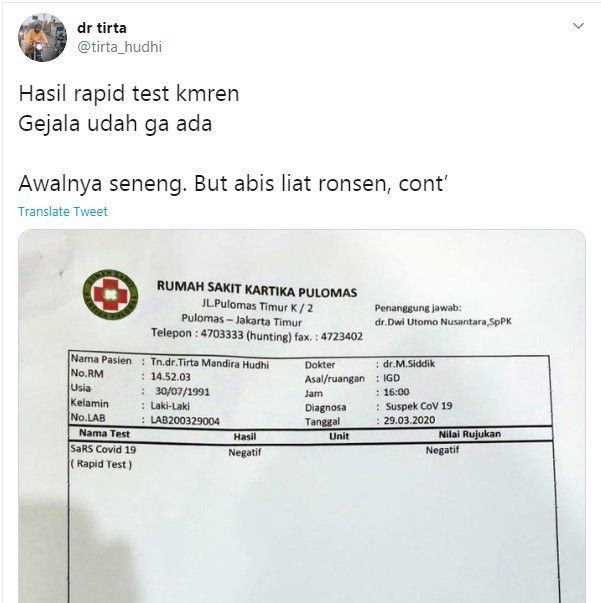 Dr Tirta lalu di rawat dan menjalani pemeriksaan Corona di Rumah Sakit Kartika. Hasil Rapid test pertama dan kedua normal, artinya negatif terkena Corona. Tapi malah kena bronkitis kronis.