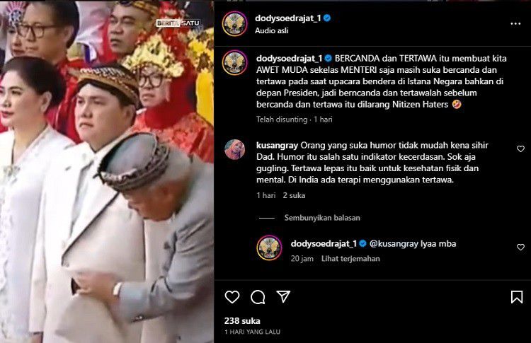 Namun di sisi lain, Doddy Sudrajat sempat terlihat menyinggung soal candaan di momen upacara. Di Instagramnya, Doddy membagikan video saat Menteri PUPR, Basuki Hadimuljono membuka jas Menteri BUMN, Erick Thohir yang viral.