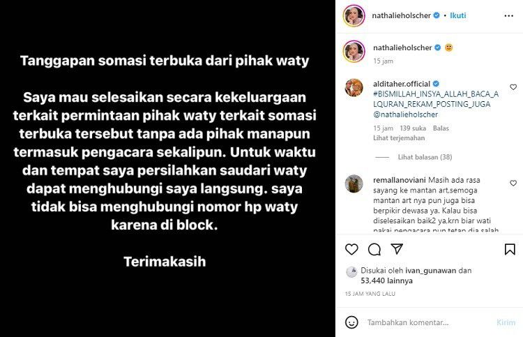 "Untuk waktu dan tempat (bertemu) saya persilahkan saudari Waty dapat menghubungi saya langsung. Saya tidak bisa menghubungi nomor hp Waty karena diblock. Terima kasih," pungkas Nathalie Holscher.