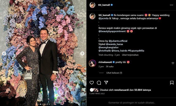 "Ke kondangan sama suami. Happy wedding @jscmila & Yakup , semoga selalu bahagia selamanya," tulis Titi Kamal sebagai caption foto yang memperlihatkan potret dirinya dengan dress glamor hitam serta Christian Sugiono yang memakai setelan jas berwatna senada.