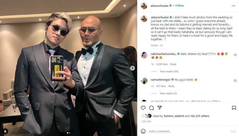 “Kurasa semua orang sudah tahu ayahku dan Ka Sabrina menikah dan jujur yang terbaik untuk mereka. Maksudku mereka sudah berkencan sangat lama jadi tidak bisa terlalu parah hahahaha, ok tapi serius meskipun saya benar-benar bahagia untuk mereka, jadi bersulang untuk kehidupan yang baik dan bahagia bersama,” kata Azka Corbuzier dengan Bahasa Inggris di keterangan fotonya.