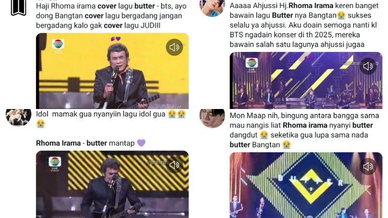 "Aaaaa Ahjussi Haji Rhoma Irama keren banget bawain lagu Butter nya Bangtan. Aku doain semoga nanti kalo BTS ngadain konser di th 2025, mereka juga bawain salah satu lagunya ahjussi juga," sambung netizen. "Haji Rhoma Irama cover lagu Butter - BTS, ayo dong Bangtan cover lagu begadang jangan begadang kalo gak cover lagu JUDIII," timpal netizen lainnya.