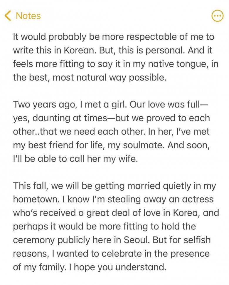 Tulisan Kevin Oh tentang rencana pernikahannya (soompi.com)